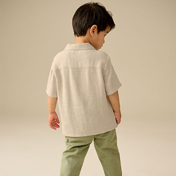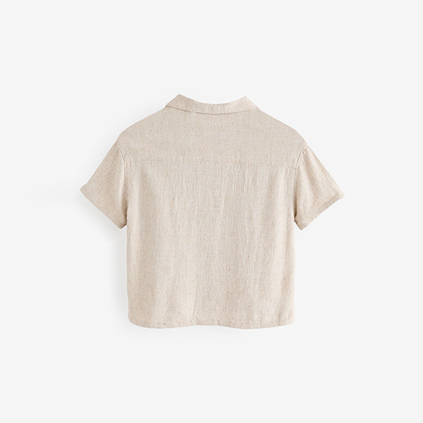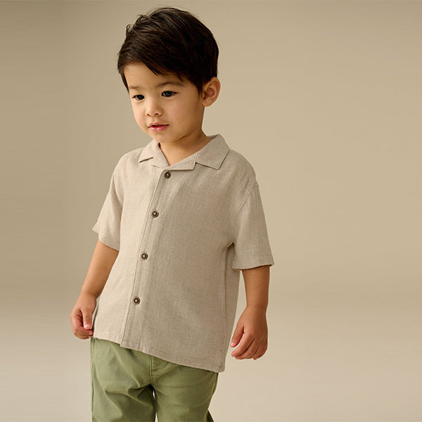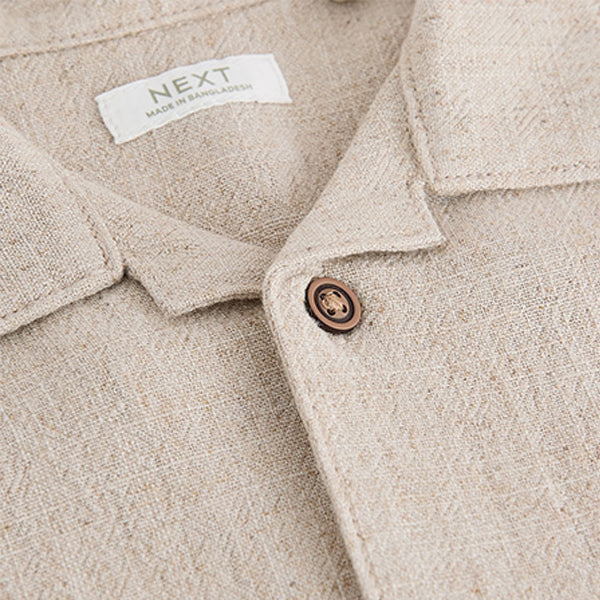 He'll look smart on holiday or on sunny days in this boxy shape shirt, featuring a soft drapey linen-blend fabric with a button-down fastening, a Revere collar and short sleeves.