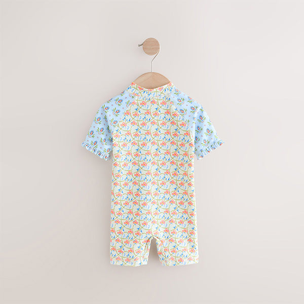 This fully lined blue and green tile print swimsuit is made from a sunsafe fabric with a UPF rating of 50+ to protect against the sun's rays, featuring a zip fastening to the front for easy dressing, finished with frill detailing to the sleeves.