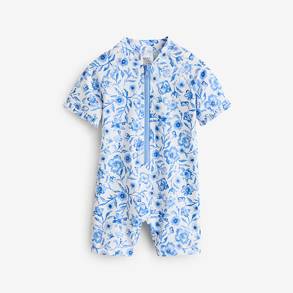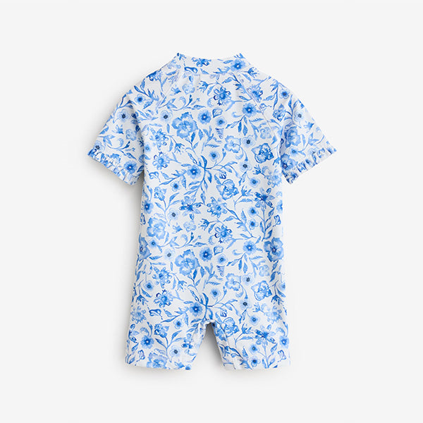 This fully lined blue floral print swimsuit is made from a sunsafe fabric with a UPF rating of 50+ to protect against the sun's rays, featuring a zip fastening to the front for easy dressing, finished with frill detailing to the sleeves.