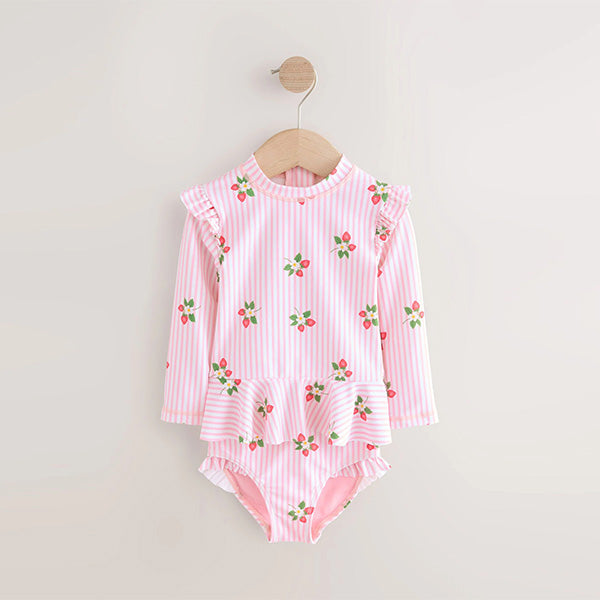 This gorgeous pink strawberry print swim set keeps them safe in the sun without sacrificing style, featuring a long sleeve top with a tall neck, a zip fastening up to ages 12-18 months and ruffle detailing, alongside a pair of matching shorts. A UPF rating of 50+ protects against the sun's rays on covered areas.