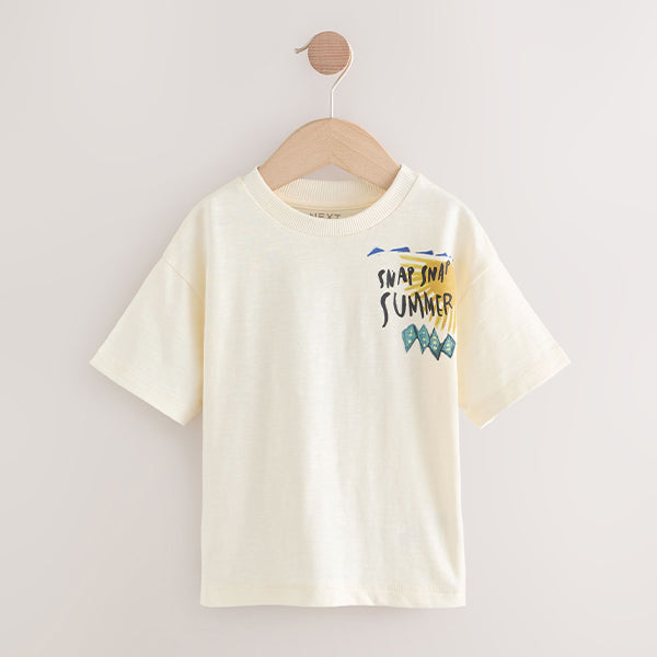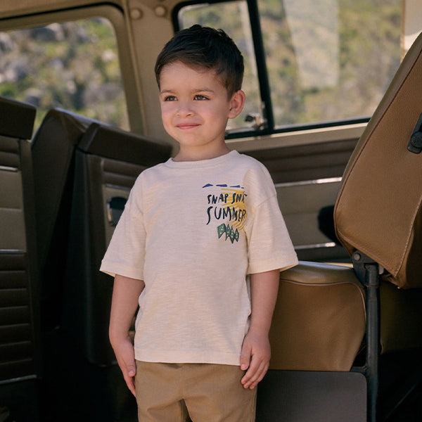 This stylish t-shirt features a summery crocodile chest and back print, set against a neutral pure cotton base with a ribbed crewneck collar.