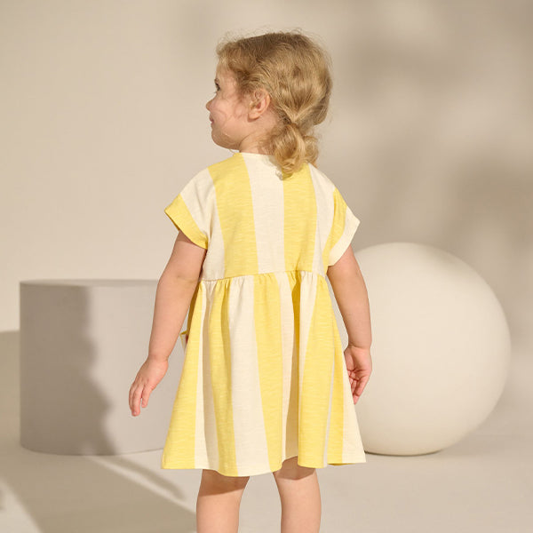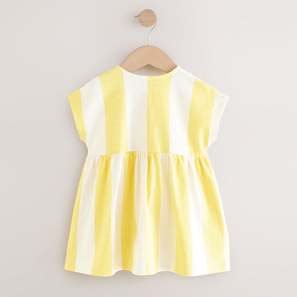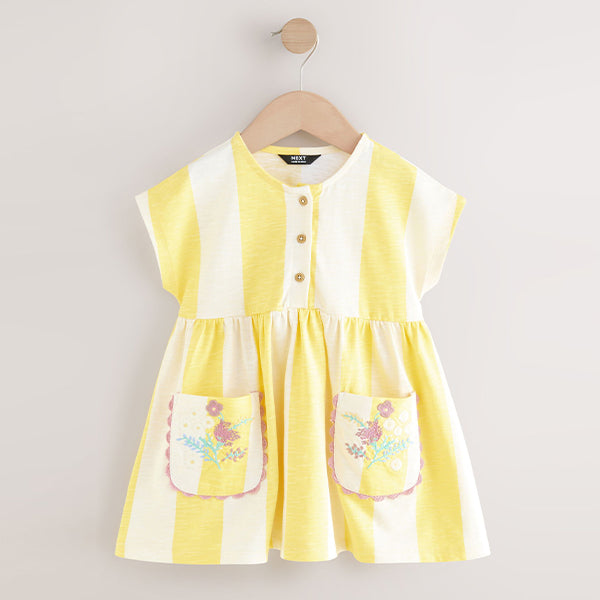 Made from a comfortable cotton jersey fabric, this pretty yellow stripe summer dress is the perfect everyday style for the warmer weather. With a button front and charming floral embroidered pocket with scallop trim, it looks great teamed with sandals for an easy sunshine-ready outfit.