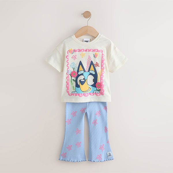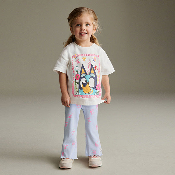 Let Bluey adorn her summer looks with this t-shirt and leggings set. In a cotton rich blend, this two piece set includes a regular fit tee and flared leggings both coated in a fun Bluey print. Complete wth crochet detailing and lettuce trim piping.