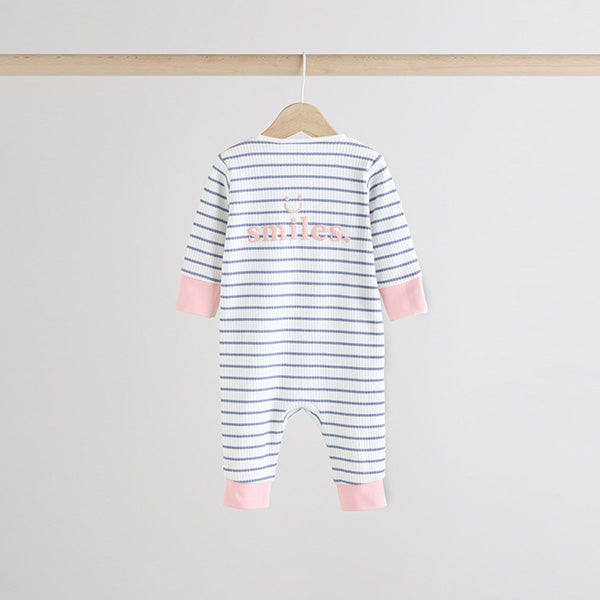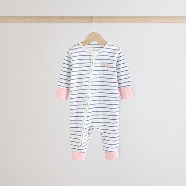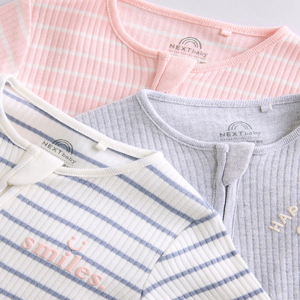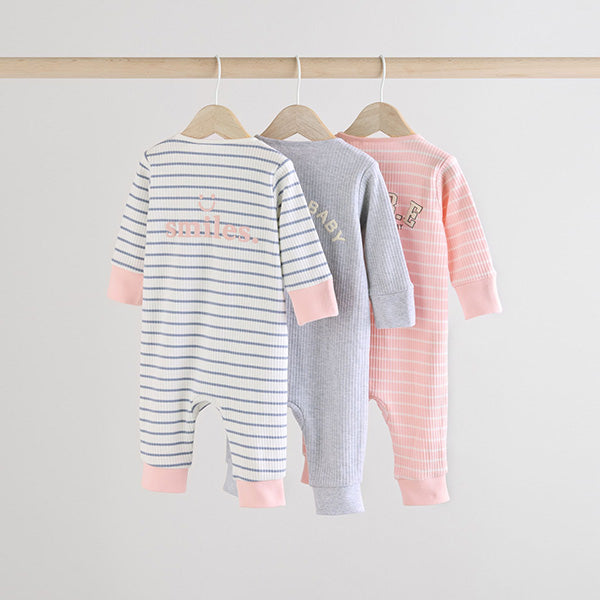 Fill up their wardrobe with this three pack of sleepsuits. Made from pure cotton, each piece features a fun slogan print design with ribbed detailing, two way zip fastening for easy dressing and a footless silhouette.