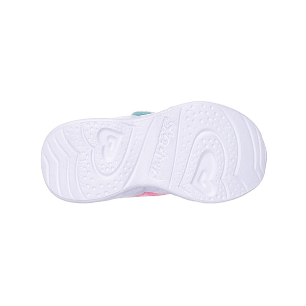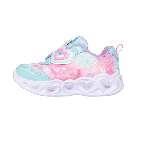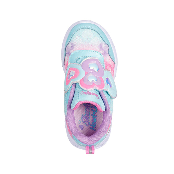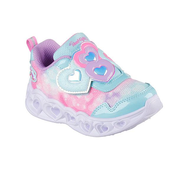 Sparkle and shine in magical delight wearing Skechers Heart Lights® - Lovin Reflection. This light-up design features a mesh upper with synthetic overlays, an adjustable instep strap closure, and a sculpted light-up midsole with 'heart chain' detail.