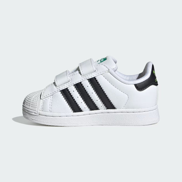 With their iconic shell toe and smooth leather upper, these toddlers' adidas Superstar shoes are instant classics. Hook-and-loop straps make them easy for little hands to slip on and off while the textile lining and OrthoLite® sockliner keep tiny feet comfortable. An Adifit insole helps ensure the perfect fit.