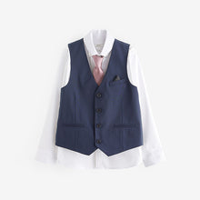 This smart 3-piece set features a classic long sleeve white shirt with a button-up fastening and pointed collar, a navy single-breasted button-up waistcoat and a smooth pink tie for the ideal ensemble.