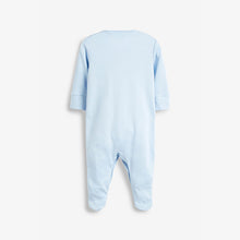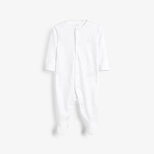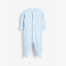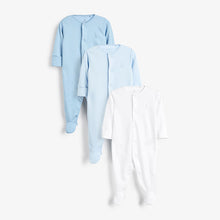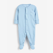 Pure organic cotton pack of three sleepsuits. This product is made from Global Organic Textile Standard (GOTS) certified organic cotton and is responsibly produced to strict environmental and social standards. Featuring printed back neck labels which are supersoft on baby’s neck. These sleepsuits have integral scratch mitts up to 3–6 months and the feet are designed with lined inners for comfort. Nickel-free poppers ensure no irritation to delicate skin and no harmful dyes or chemicals have been used, keeping your baby safe. Plus, full front openings have a coloured popper on the inside to make dressing easier. Includes two blue and one white options.