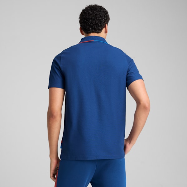 Rev up your wardrobe with this PUMA polo featuring a sleek button-down design, BMW M Motorsport logo print, and chest pocket with taping detail. The half raglan sleeves and collar tipping add a sporty touch, perfect for your next adventure.