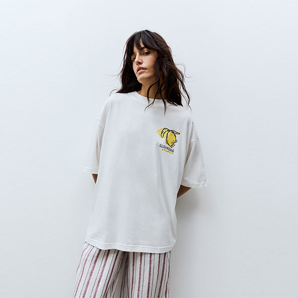 Our funky Limonda tee features a bright lemon back graphic on a crisp white base. Crafted from 100% cotton with a crew neck and relaxed fit. This summery tee is paired perfectly with denim shorts or a maxi skirt for a feminine twist.