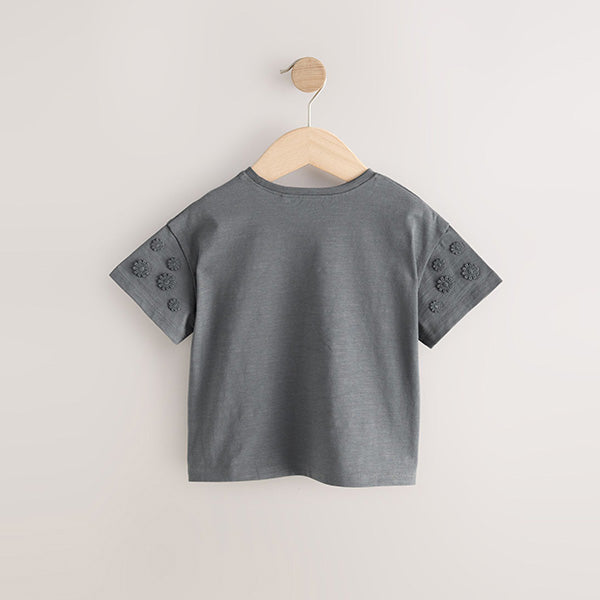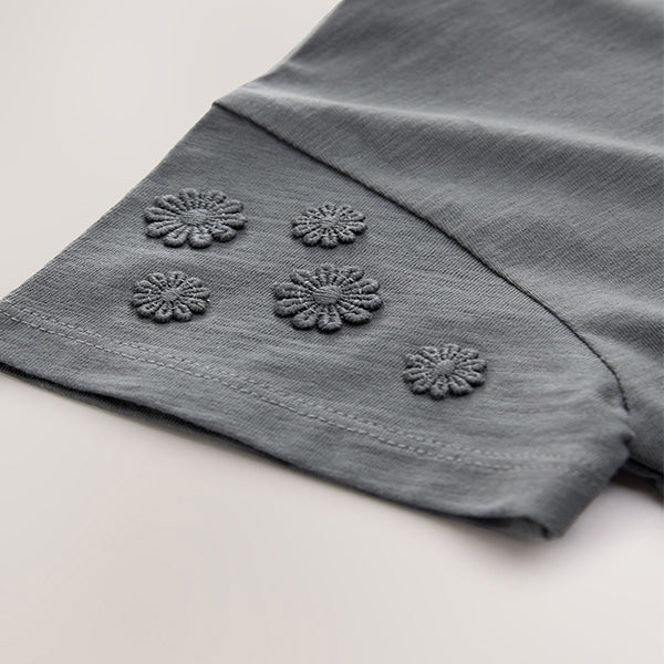 Made from pure cotton, this charcoal grey short sleeve t-shirt has pretty embroidered daisy detailing and a crewneck collar, perfect for adding a statement look to their everyday outfits.
