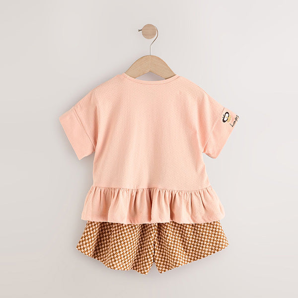 Bring sunshine to her day with this adorable coral pink set. Crafted from soft 100% cotton, the peplum t-shirt features charming flower embroidery and short sleeves, perfect for warm weather. Paired with coordinating shorts, this outfit offers a sweet and comfortable look for any little adventurer.