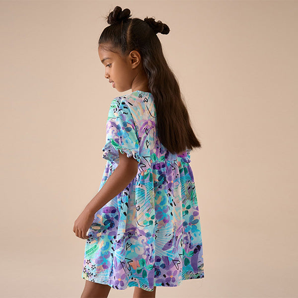 This comfortable pure-cotton dress has a blue graffiti print, featuring a round collar with ruffle detailing to the short sleeves, ideal for their everyday wear or parties.