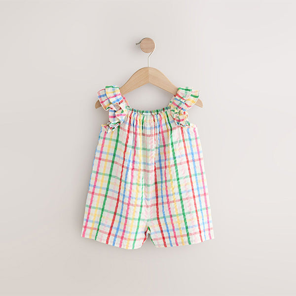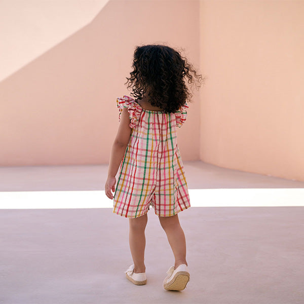 A summer staple, our girl's cotton playsuit makes a cute and a comfortable addition to her wardrobe. In a pull-on style, it's complete with frill detailing and an elasticated neckline for a comfy fit.