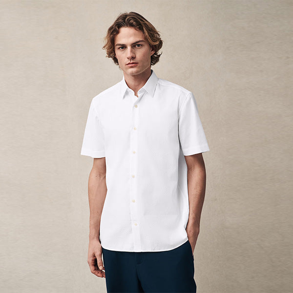 Made from pure cotton, this white short sleeve shirt is a smart-casual summer staple, cut to a regular fit with a textured feel, a button-down fastening and a classic collar.