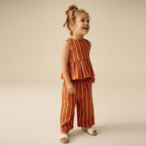 This 2-piece set is a coordinating outfit for warm weather wear, made from pure cotton across and sleeveless blouse with tiered skirting and a pair of pull-on wide leg trousers with an elasticated waistband, decorated with a rust orange and checkerboard stripe design.