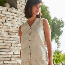 This simple but stylish sleeveless top is so versatile it can be easily dressed up or down depending on the occasion. With front button fastening, v-neck and delicate pintuck detail on shoulders. Made from a blend of linen and and metallic fibres.