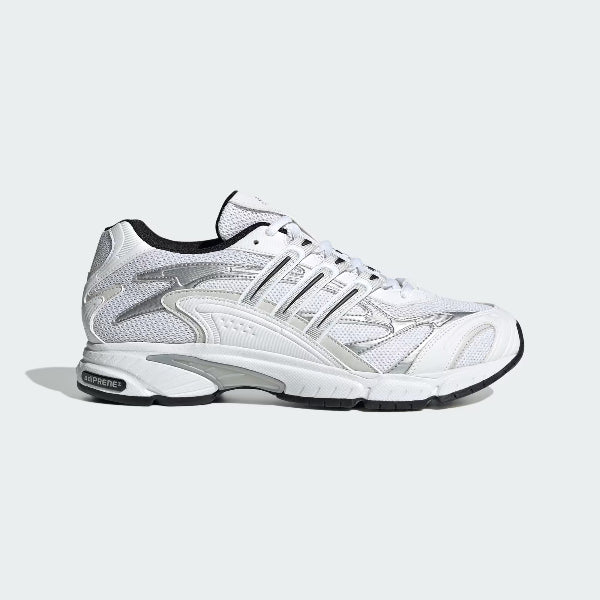 A running-inspired adidas shoe with metallic accents.