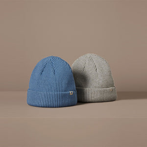 This 2-pack of blue and grey cosy beanie hats are made from a ribbed fabric, in a super soft yarn with a turn-up cuff, finished with woven star print labels.