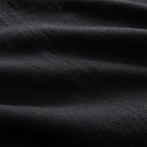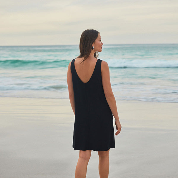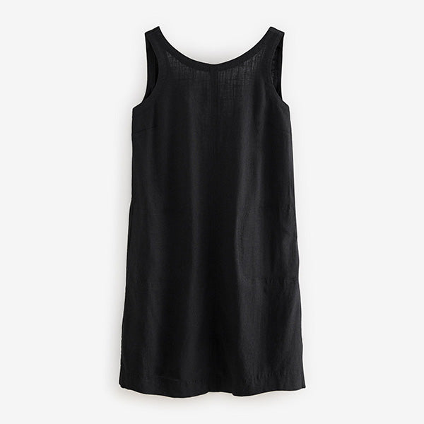 Made from a lightweight linen-blend that's ready for summer, this mini-length black dress is perfect for everyday wear during warmer weather, featuring a scoop back neck, side pockets and a split side hem.