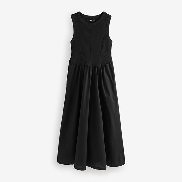With a racer shape, this black midi-length dress features a ribbed cotton-blend bodice with stitched detailing, alongside a smooth pure cotton skirting with side pockets. Easy to dress up or down.