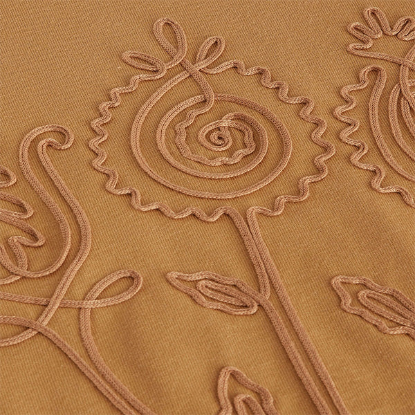 This short sleeve t-shirt is made from pure cotton in a heavy weight, featuring aan ochre yellow base with an embroidered floral design and a ribbed crewneck collar. Perfect for layering with a casual or smart casual outfit.
