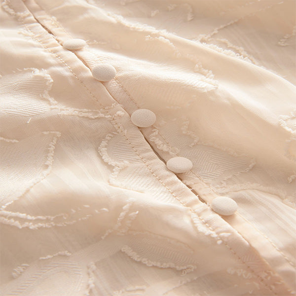 This gorgeous ecru blouse top has a V-Neck collar with a button front and jacquard all-over floral detailing, finished with volume sleeves and frilled elasticated sleeve cuffs. Ideal for the office or a night out on the town.