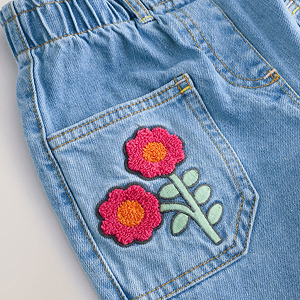 These adorable jeans have a pull-on elasticated waistband for easy wear, made from pure cotton denim with front and back patch pockets, decorated with embroidered flower, butterfly and bee patches.