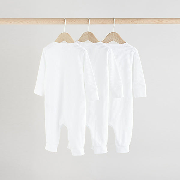 Nestle you newborn in our 3 pack of white footless sleepsuits. Made from pure cotton, each piece is designed with two way zip fastening for easy dressing and features a subtle ribbed design.