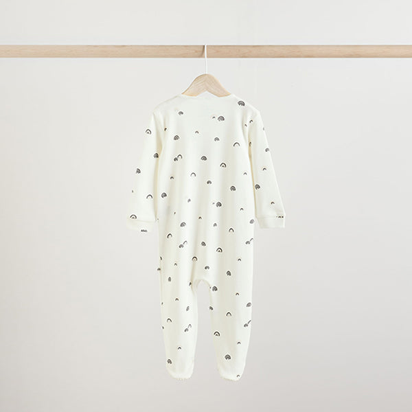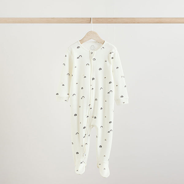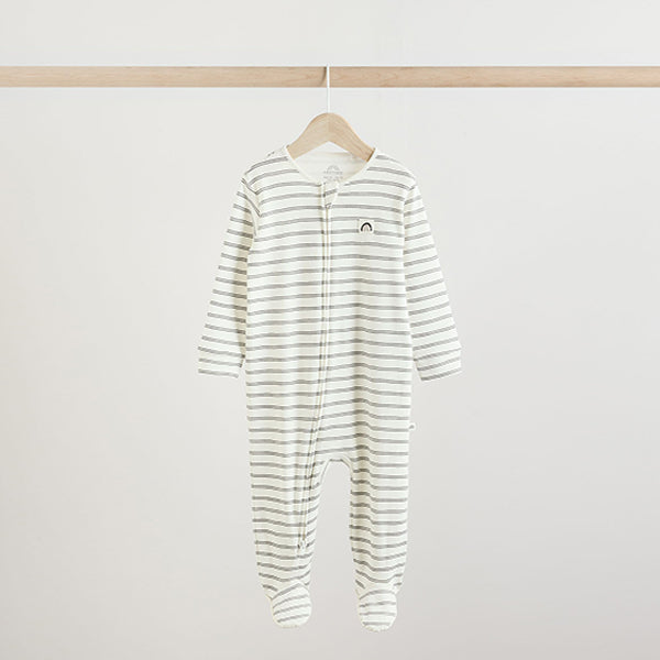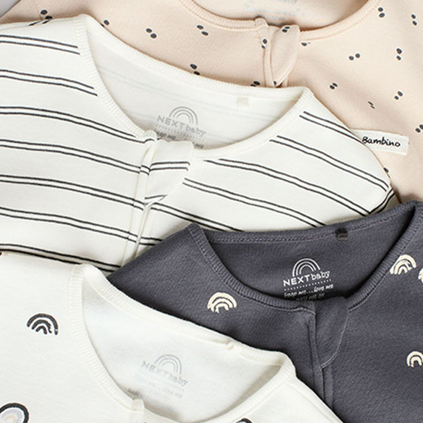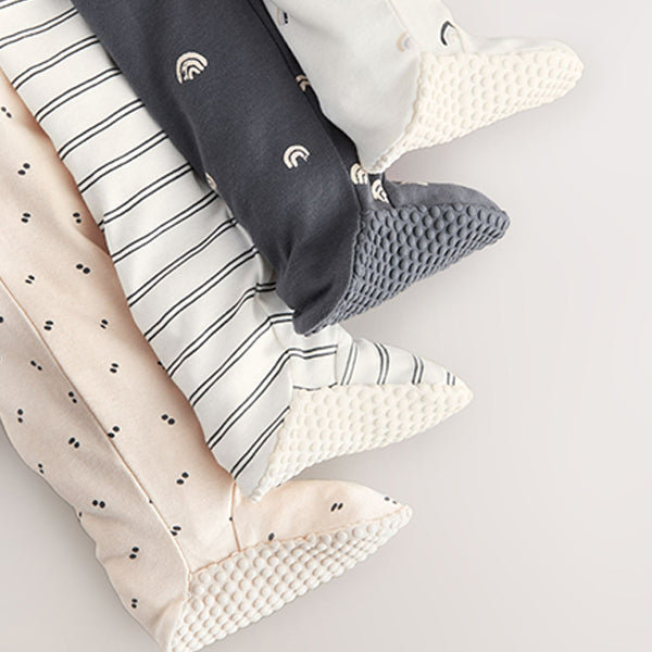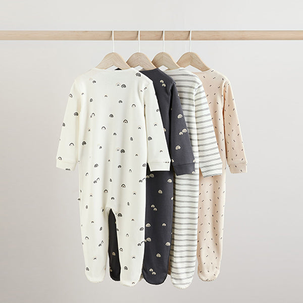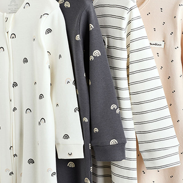 This four pack of sleepsuits are a great way to stock-up on their sleepwear essentials, made of a super soft cotton in rainbow, stripe and spot prints. Each sleepsuit has a two-way zip fastening for easy dressing, turn-back scratch mitts up to ages 3-6 months, inner lined feet and anti-slip sole prints from 9-12 months.
