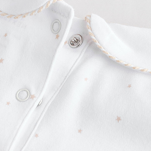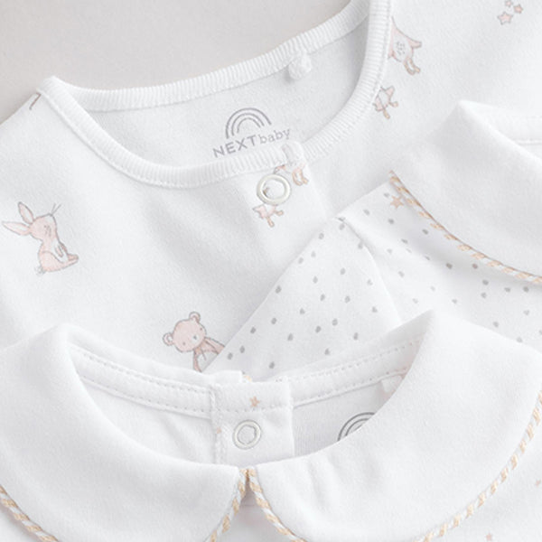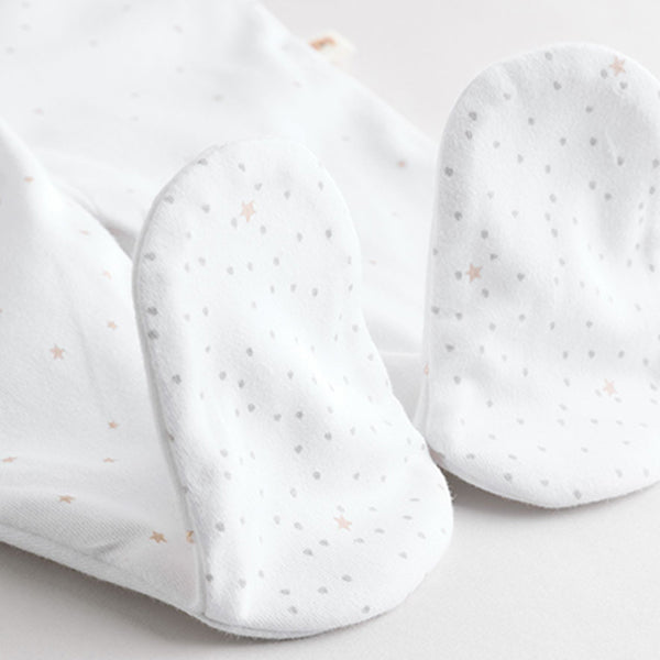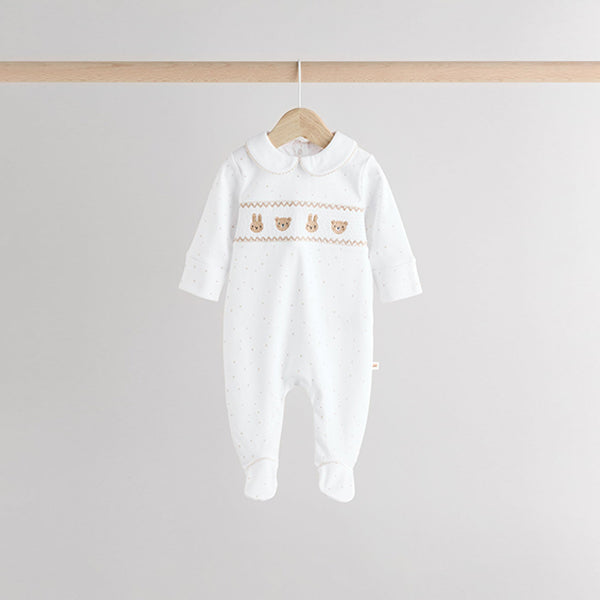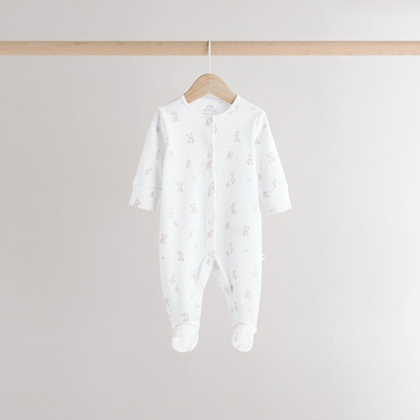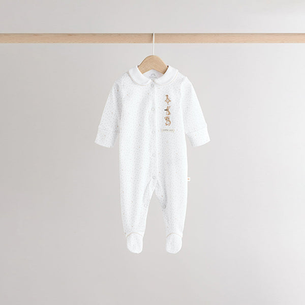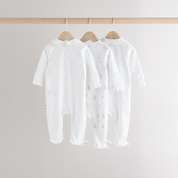 Stock-up on their sleepwear staples with this 3-pack of pure-cotton sleepsuits, in a white base with printed and embroidered bear, bunny and duck characters in neutral hues, featuring collar and collarless designs. Each sleepsuit has a popper fastening, turn-back scratch mitts up to 3-6 months, inner lined feet and an anti-slip sole print from sizes 9-12 months.