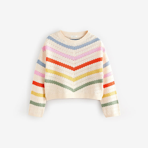 Add a wave of colour to her winter wardrobe with our rainbow jumper. Made from pure cotton, this stylish jumper is cut in a boxy fit for a more relaxed look and is adorned with a colourful stripe design for some extra fun. Pair with jeans and trainers from a trendy look.