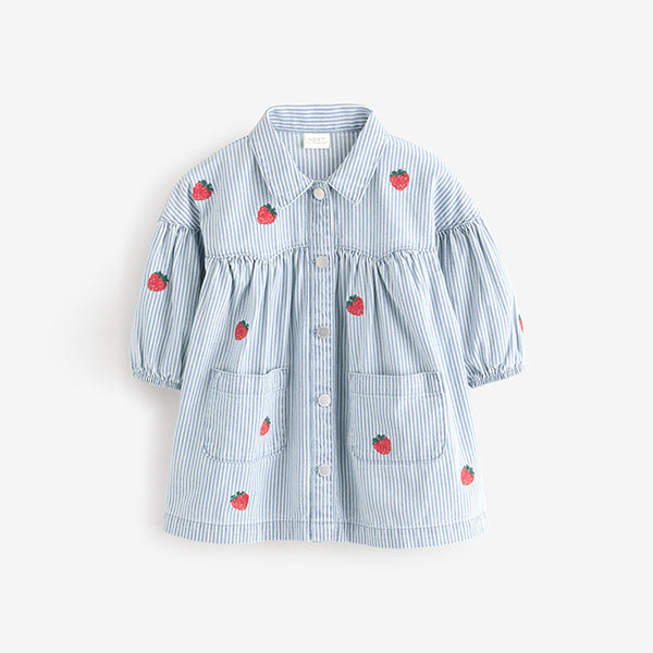 This cute blue stripe dress has a shirt-style design with a pure-cotton denim fabric and strawberry embroidery, featuring a snap fastening for easy dressing, a classic collar and patch pocket, finished with elasticated sleeve cuffs.