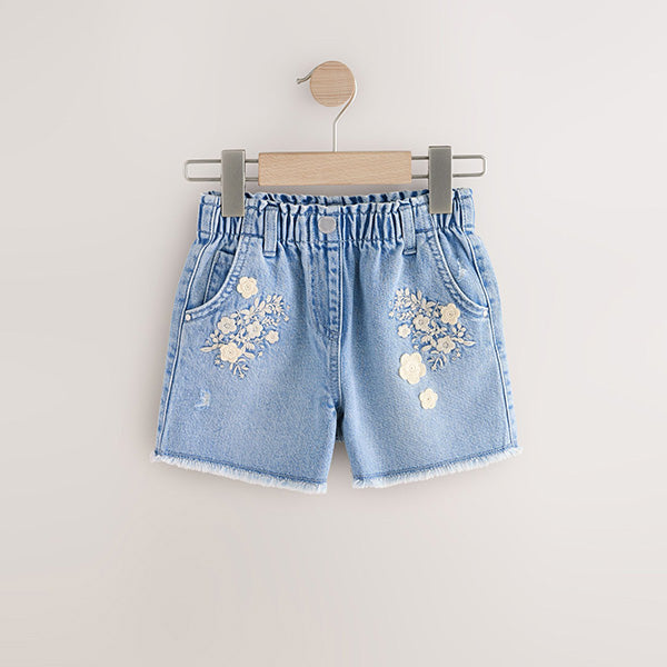Made from a pure cotton denim fabric in a light blue wash, she'll reach for these shorts all summer long. The shorts have an adorable embroidered flower design, with an elasticated waistband for easy pull-on wear, side and rear pockets and a frayed hem to the leg.