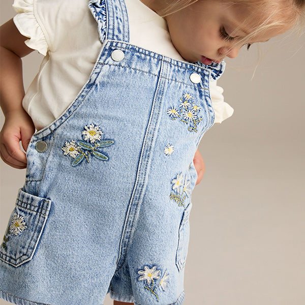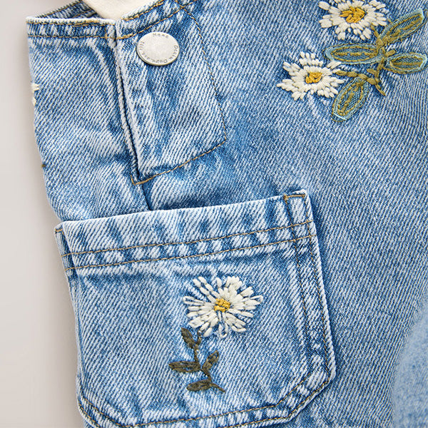 An adorable 2-piece set for spring and summer, this fuss-free outfit features a pure-cotton blouse with short frilled sleeves and a crewneck collar, alongside a pair of denim dungarees with floral embroidery, patch pockets and shoulder straps.