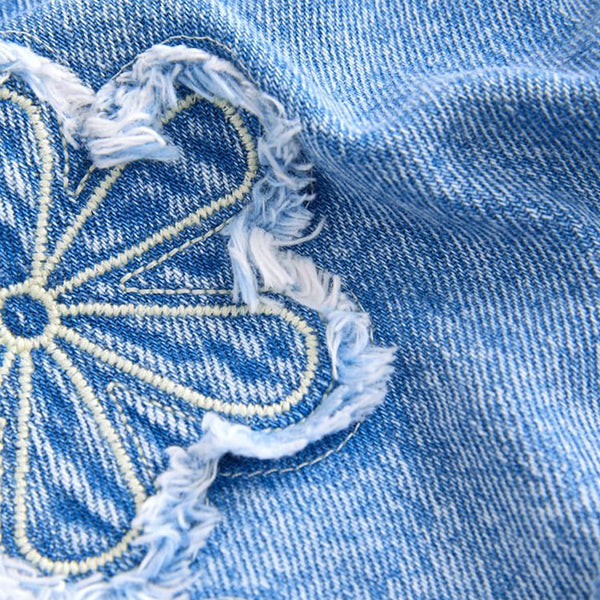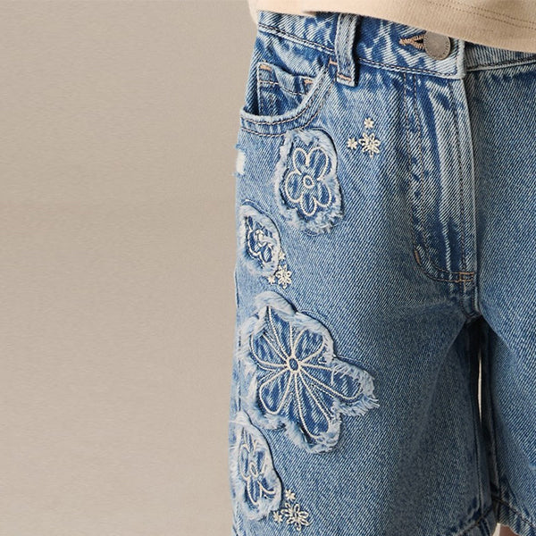 Made from a pure cotton denim, these stylish shorts have a retro-inspired distressed finish with an embellished flower design, a button and zip fastening and 5-pocket detailing.