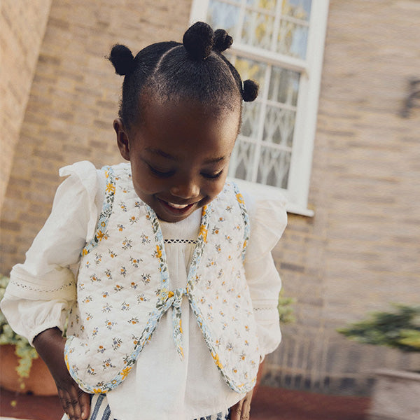 This cream ditsy gilet and blouse set is the perfect transitional outfit. Featuring a pretty quilted floral print gilet with tie fastening and a long sleeve blouse with lace trim, this dreamy duo would look great paired with jeans and trainers.
