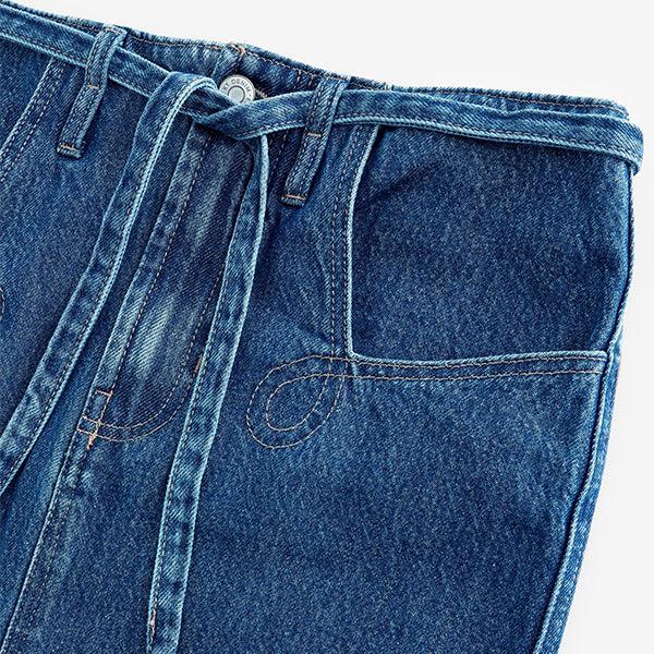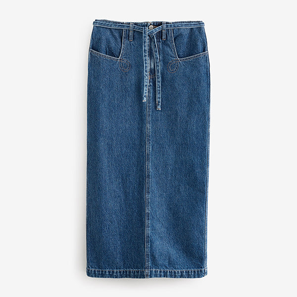 In a mid-blue wash, this midi denim skirt have as Western look, thanks to the contrast stitch detailing. A matching slim belt sits at the waist, finished with side and rear pockets.