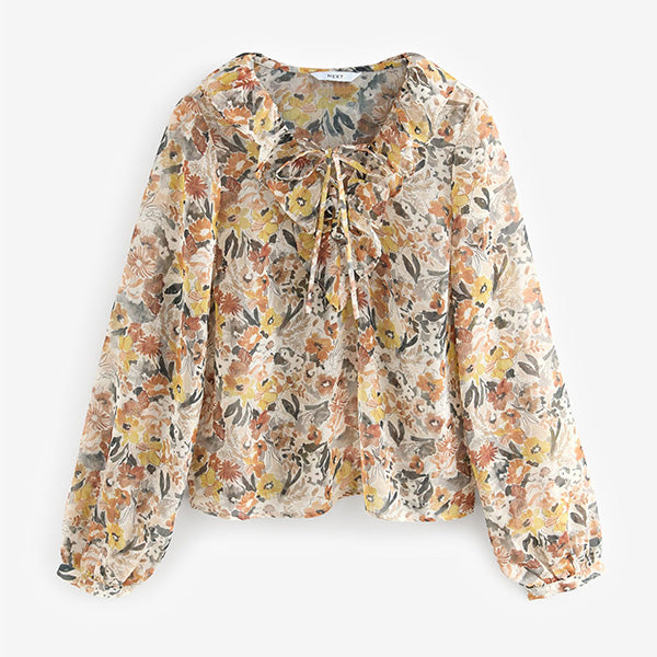 In a lightweight sheer fabric, this gorgeous floral print blouse can be worn casually or to the office, featuring tie neck detailing and long volume sleeves. Perfect for layering.