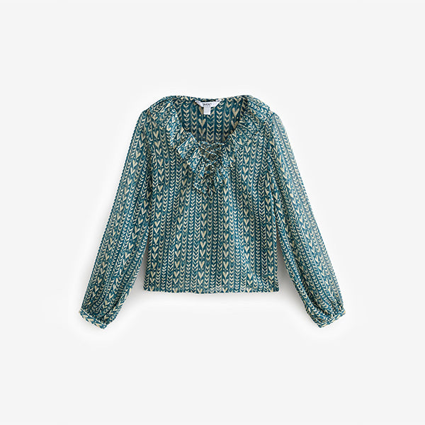 In a lightweight sheer fabric, this gorgeous teal blue blouse can be worn casually or to the office, featuring tie neck detailing, a heart print and long volume sleeves. Perfect for layering.