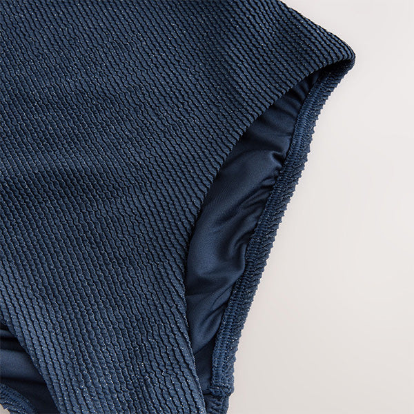 This classic navy blue swimsuit has a flattering plunge neckline, with removable shoulder strap for a bandeau option and glitter-effect crinkle fabric. The swimsuit has high cut legs and shaping mesh around the tummy for a smoothing effect, finished with branded NEXT hardware.