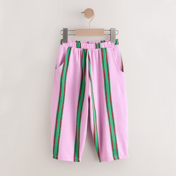 The pink and green striped trousers have a barrel-shaped wide leg with a textured cotton-blend fabric, an elasticated waistband and pockets, perfect for a trendy casual look.