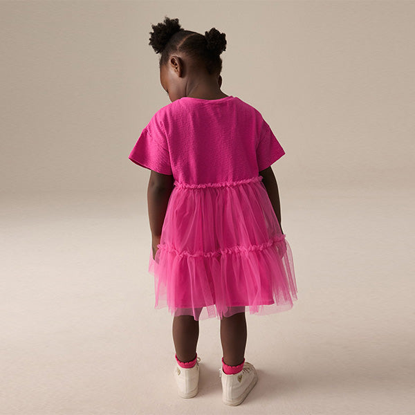 This beautiful pink dress has a comfortable cotton bodice with short sleeves, a 3D floral character and a crewneck collar, contrasting with the tiered mesh skirting with ruffle detailing, finished with a comfortable cotton lining. Ideal for parties.