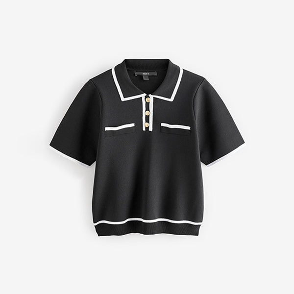 This black and white smart short sleeve shirt has a warm knitted construction with a button-up fastening leading to a classic collar, finished with contrast trims for an elevated look and a ribbed hem.