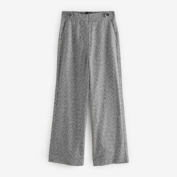These stylish wide-leg trousers have a textured boucle fabric design with button detailing to the hip, a half-elasticated waistband for a comfortable fit, side slit pockets, trimmed back pockets and a hook and zip fastening.