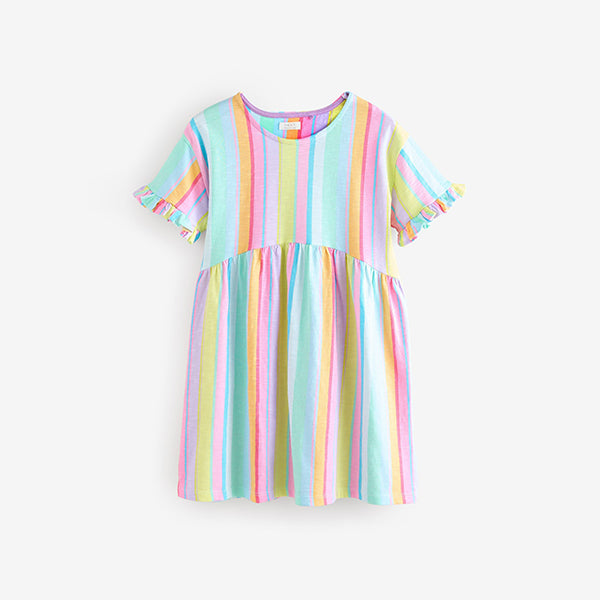 This comfortable pure-cotton dress has a rainbow stripe print, featuring a round collar with ruffle detailing to the short sleeves, ideal for their everyday wear or parties.