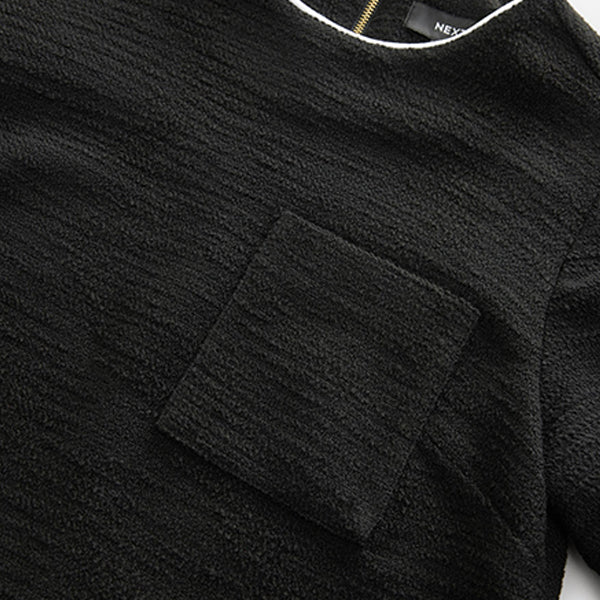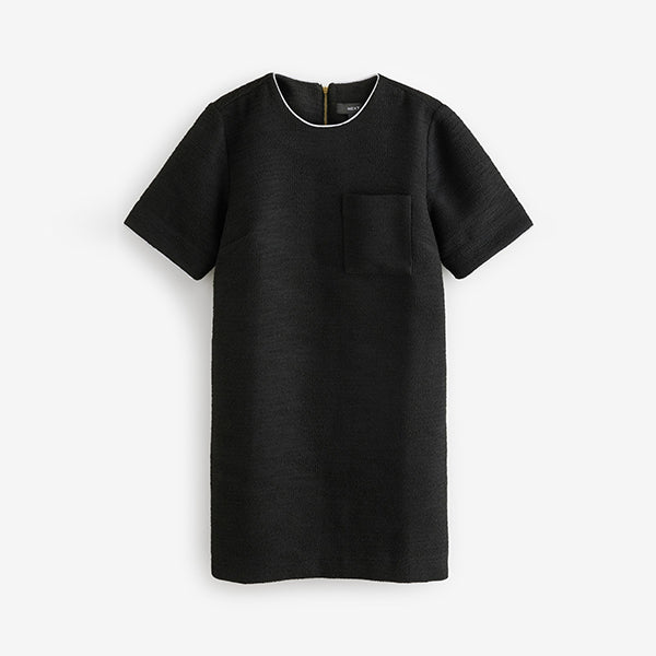 In a boxy shape, this stylish mini-dress has a versatile look that's perfect for a trendy casual look or a tastefully understated office outfit, made from a textured boucle fabric with a scoop pocket, a white trim to the collar and a zippered fastening to the back of the neck.