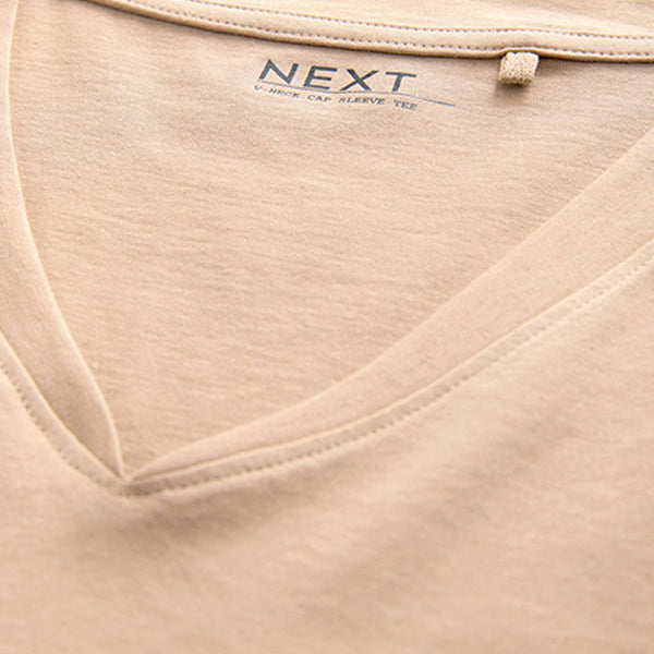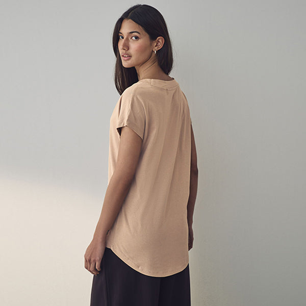 Our neutral v-neck cotton t-shirt is a piece for all seasons. Designed with cap sleeves and a v-neckline, this flattering tee is perfect for everyday wear.