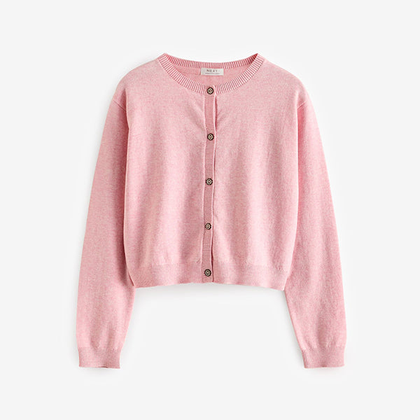 In a cotton-rich knitted fabric, this pink layering staple features a button-up fastening with a round neck, ribbed sleeve cuffs and a ribbed hem.