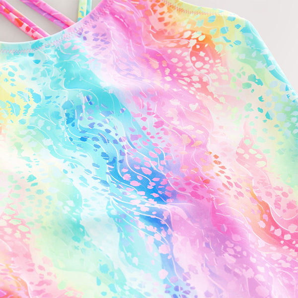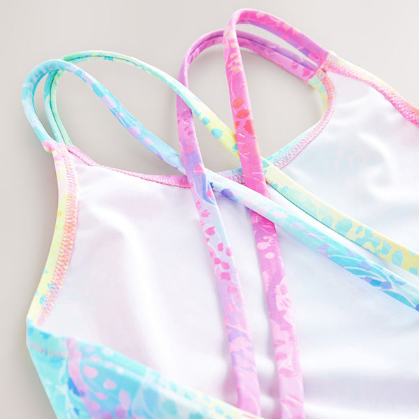 This bright and bold swimsuit has a multicoloured abstract swirl print, featuring double crossover back straps for comfortable wear and a round neckline. Holiday mode, activated.